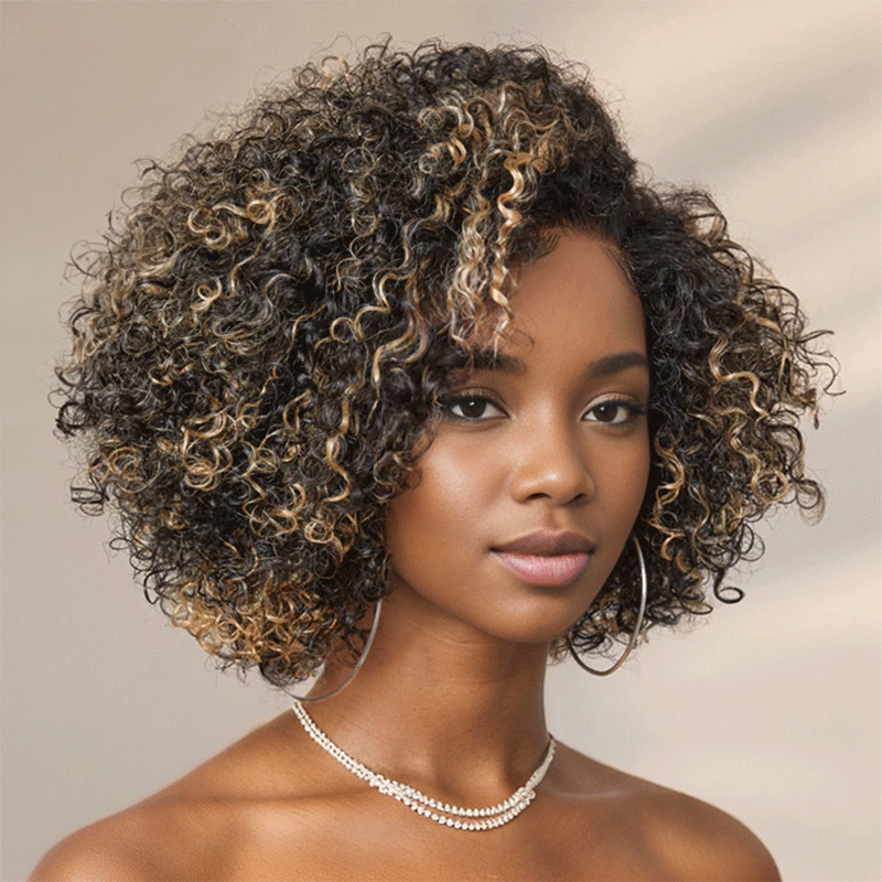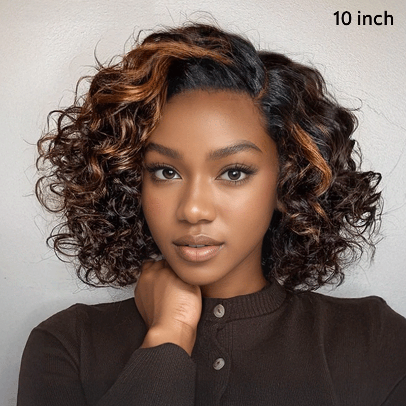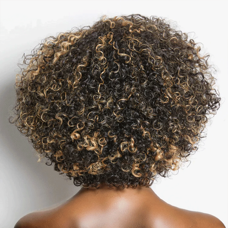 Ready to Go 9x6 Glueless Brown Highlight Bob Kinky Curly Human Hair Wig -