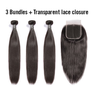 Transparent 4*4 Closure + 8A Brazilian Virgin Hair Straight 3 Bundles