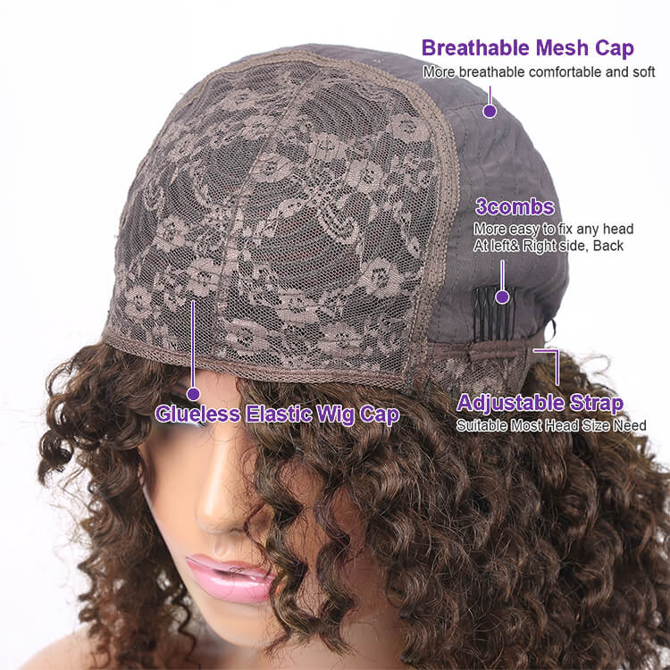 Peluca de cabello humano brasileño con flequillo Resaltado marrón Jerry Rizado Cabello sin cola 180% Densidad para mujeres negras