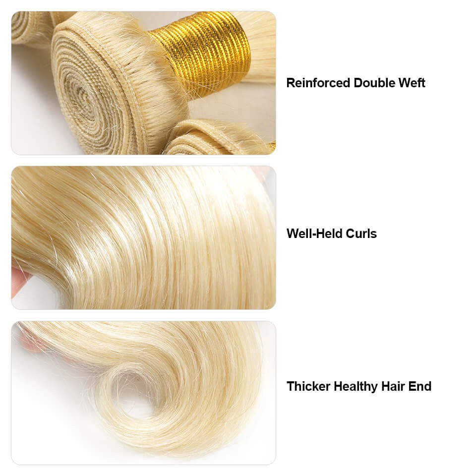 The #613 blonde virgin hair bundle is made of 100% real human hair. It can be dyed and restyled very well.For a full look, we suggest 3 bundles for length shorter than 18 inches. 4 bundles or 3 bundles with a closure/frontal for longer hair.