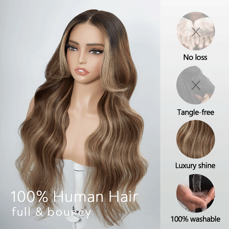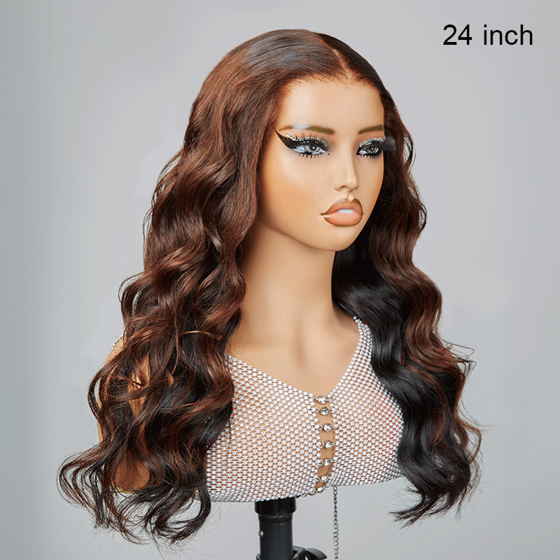 Elegant Fluffy 13x4 Glueless Brown Highlight Color Wavy Wig 100% Human Hair -